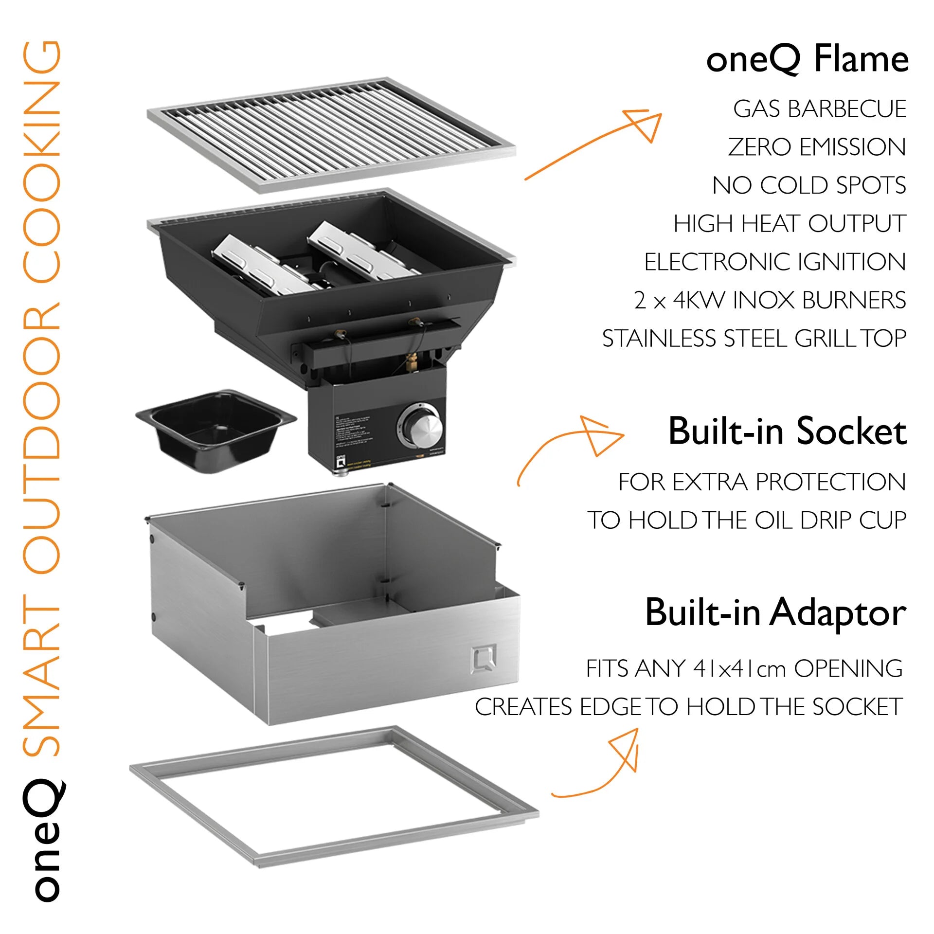 Let op: om de gasbarbecue van oneQ in te bouwen heb je ook de Built-in Adaptor en Built-in Socket nodig. Liever grillen met een deksel? Schaf dan ook de Built-in Hood Adaptor en Roasting Hood aan.