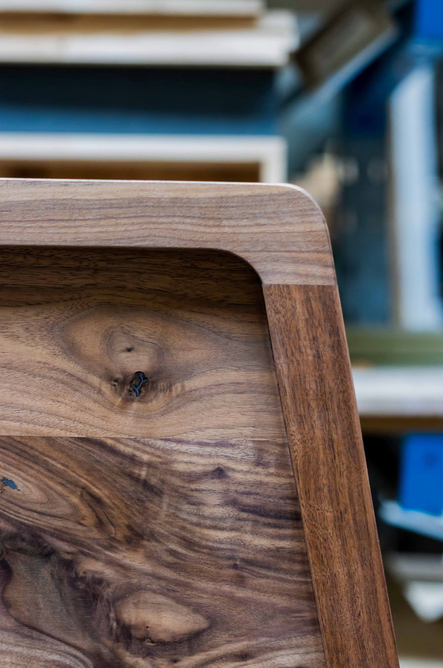 Het notenhout is afgewerkt met een transparante behandeling met een lichte glans, waardoor de warme kleur, levendige nerf en diepte van het hout prachtig naar voren komen, zonder het natuurlijke karakter te verliezen.