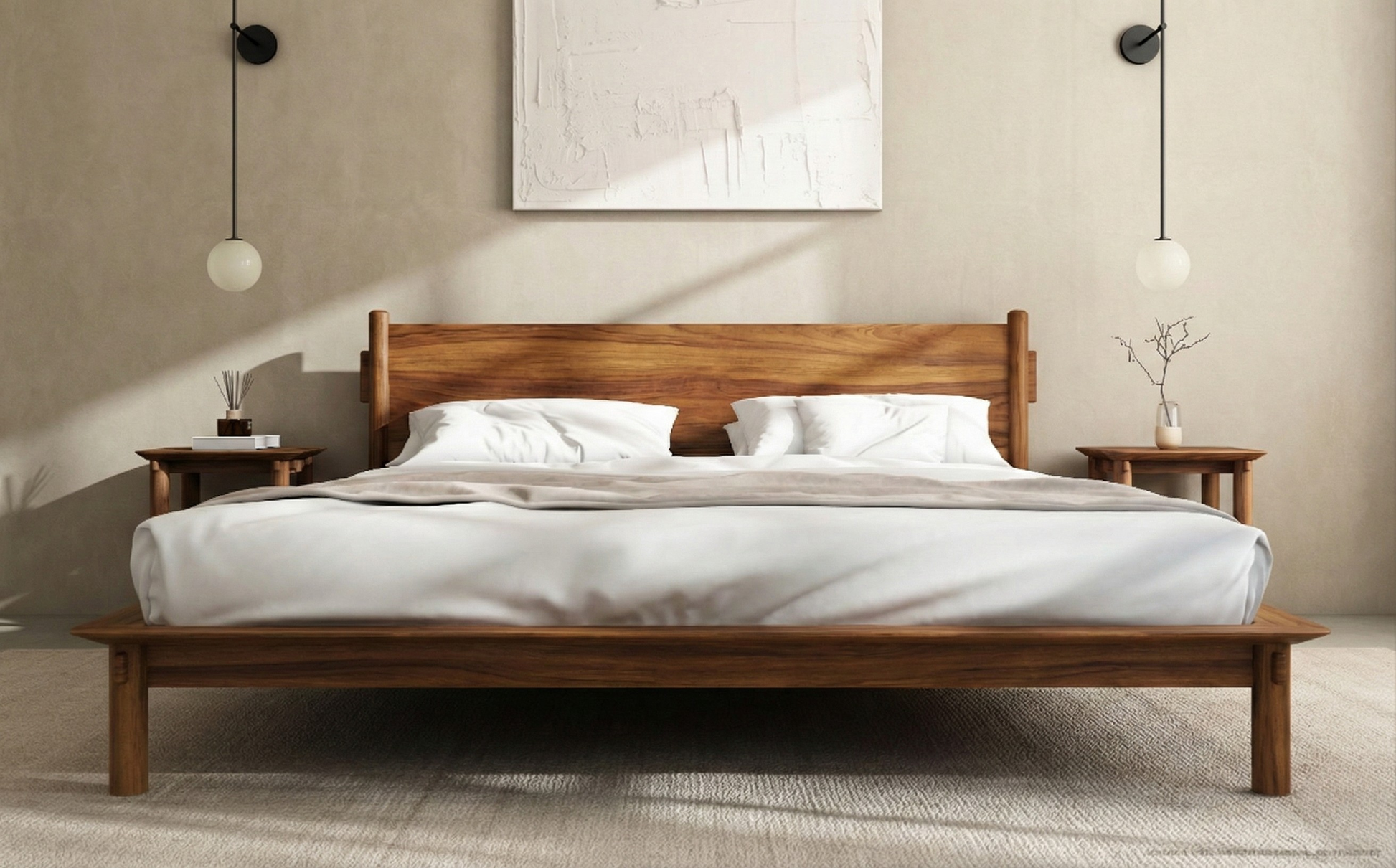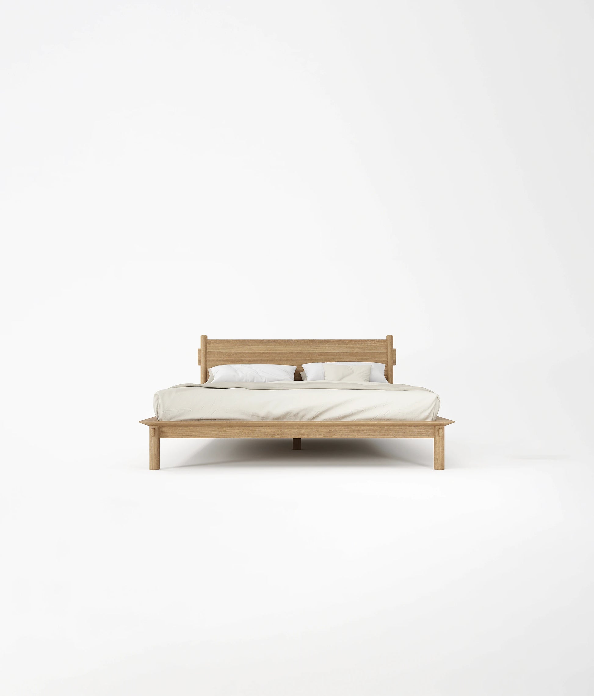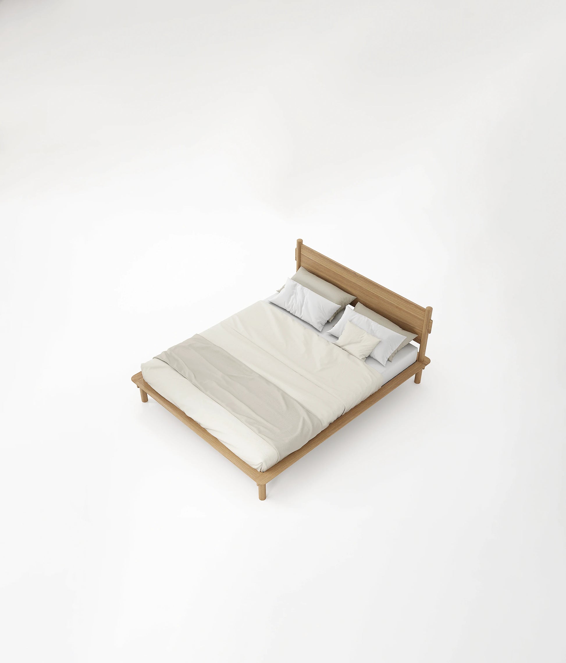 De bedombouw is vervaardigd uit massief naturel eikenhout of FSC-gecertificeerd teak hout en afgewerkt met een naturel transparante coating. Deze afwerking beschermt het hout en laat tegelijkertijd de natuurlijke kleur en nerf volledig tot hun recht komen. De afwerking onderstreept het pure karakter van het materiaal zonder het ontwerp te overheersen.