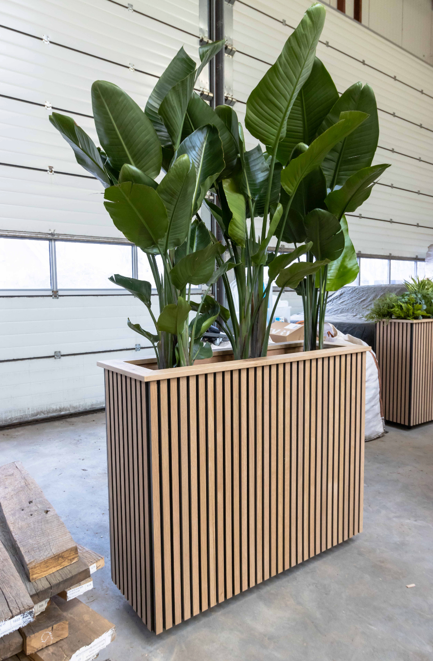 De plantenbakken op de foto hebben een afmeting van 120cm x 40cm x 100cm, incl. wielen en zijn voorzien van hoge échte planten.