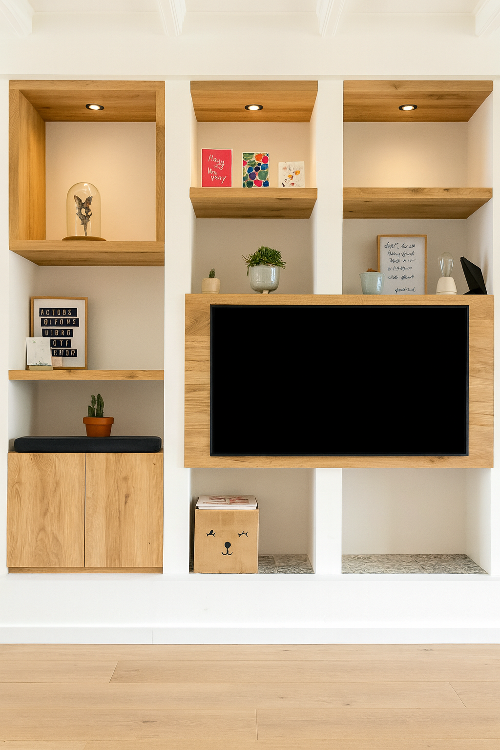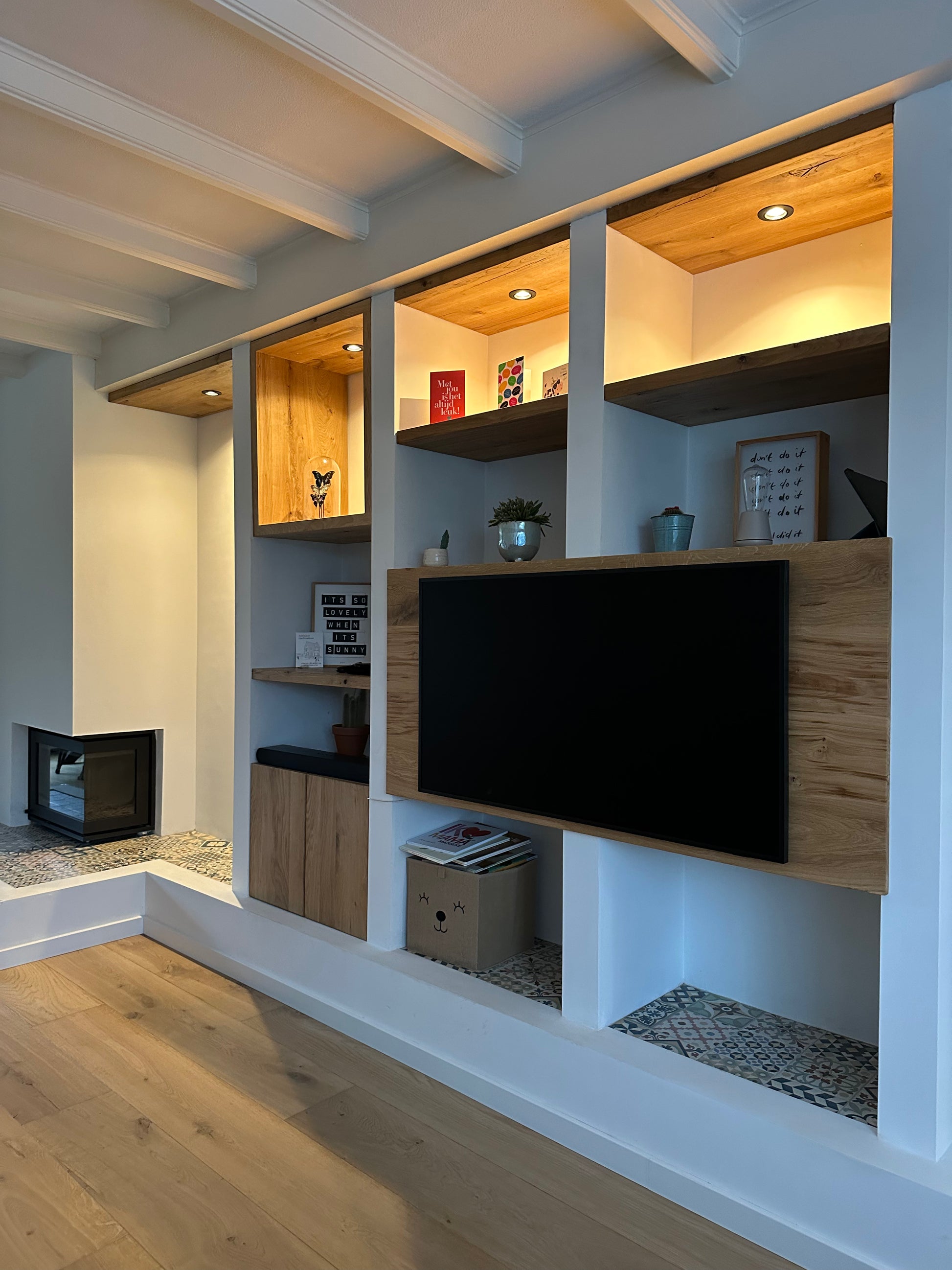 De wand bestaat uit een doordachte combinatie van open legplanken, dichte kastgedeeltes, een tv-plank en op maat gemaakte plafondplanken met geïntegreerde dimbare spots. Dit zorgt overdag voor een strakke, natuurlijke uitstraling en ’s avonds voor sfeervolle verlichting die het hout prachtig uit laat komen.