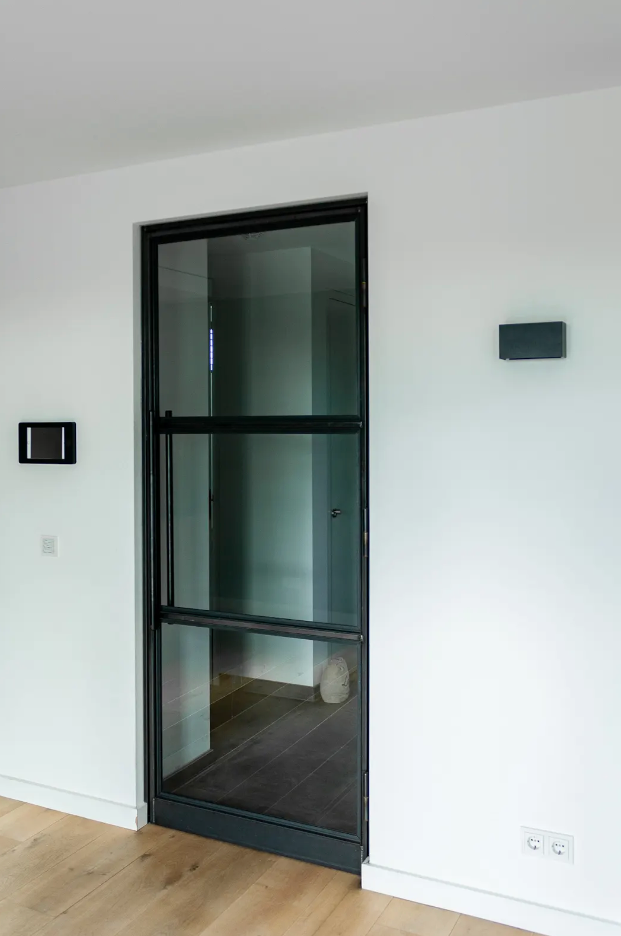 Breng een industriële en moderne touch in uw interieur met onze stalen scharnierdeur. Deze deur combineert de robuuste uitstraling van zwart gepoedercoat staal met de elegantie van glas, waardoor een stijlvolle en functionele scheiding tussen ruimtes ontstaat. Voorzien van gelaagd glas 331 voor extra veiligheid en geluidsisolatie, en een rolslot voor soepele en betrouwbare sluiting. Maatwerk is mogelijk, zodat de deur perfect aansluit bij uw specifieke wensen en interieur.
