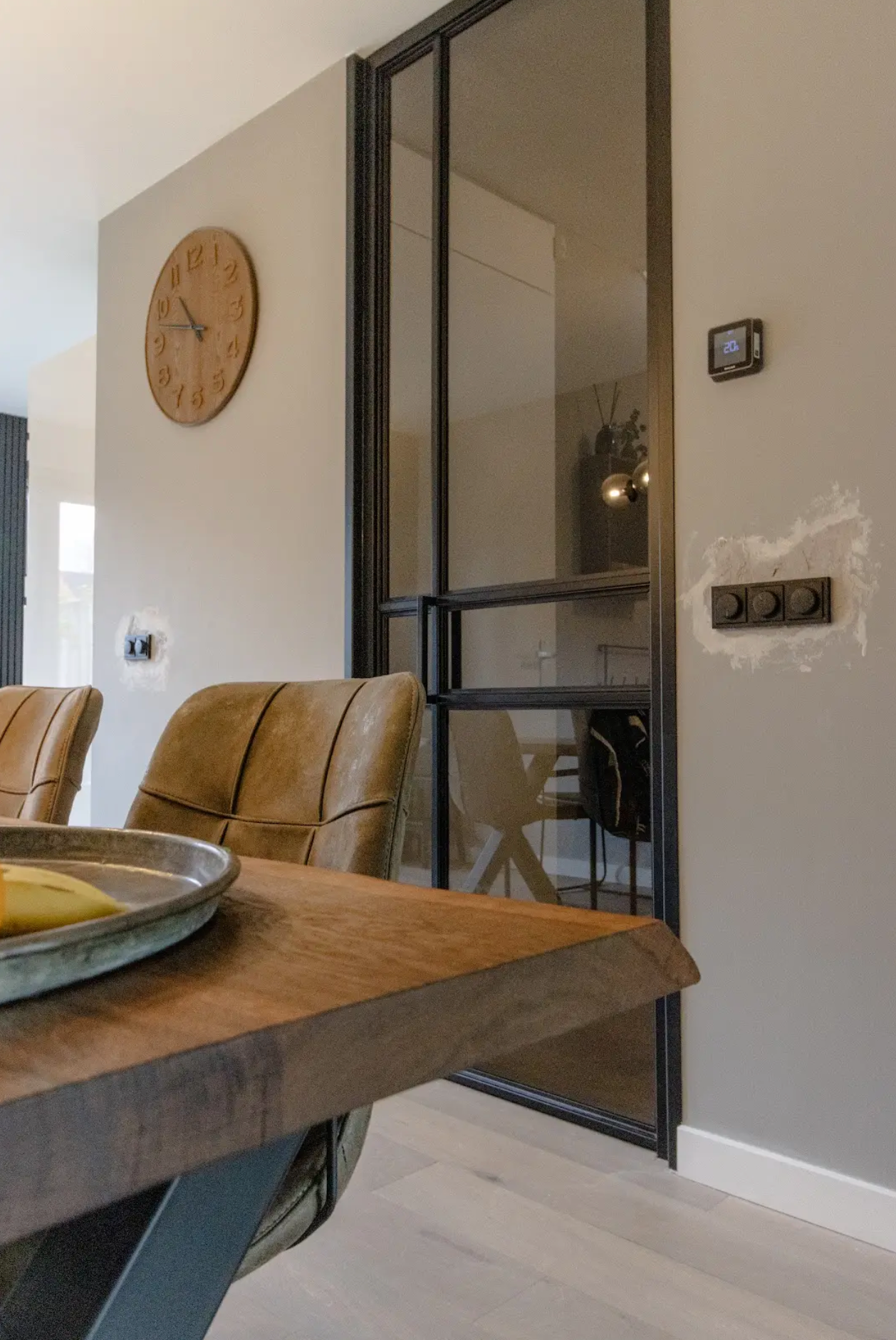 De combinatie van zwart staal en rookglas geeft je interieur een luxueuze en eigentijdse uitstraling, terwijl het glas zorgt voor een perfecte balans tussen privacy en lichtinval. Dankzij de maatwerkopties en het strakke rolslot past deze deur moeiteloos in elke moderne of industriële woonruimte.