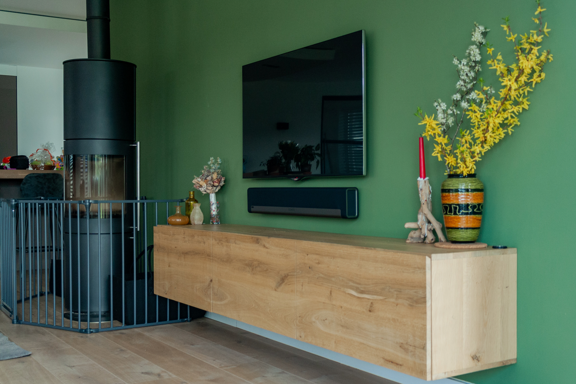 Dit zwevende tv-meubel van Rustiek New Oak past perfect in een modern interieur.