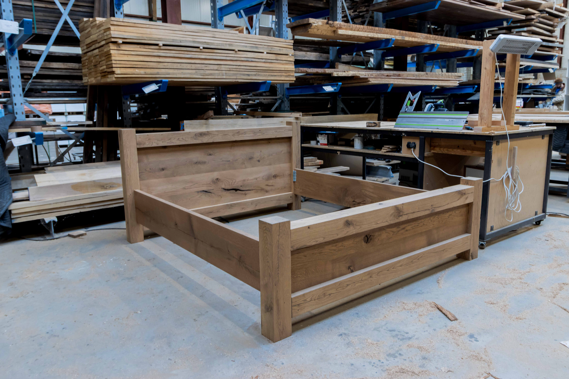 De constructie bestaat uit massieve balken van 12 x 12 cm, gecombineerd met stevige eiken planken van 40 mm dik. Het hout is zorgvuldig glad geschaafd, waardoor het bed strak en comfortabel aanvoelt.